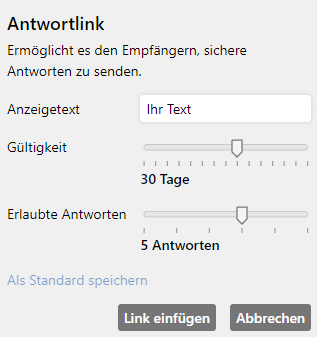 - Geben Sie den Anzeigetext für den Antwortlink ein und legen Sie die Gültigkeit sowie die erlaubte Anzahl an Antworten fest, die über diesen Link versendet werden dürfen.