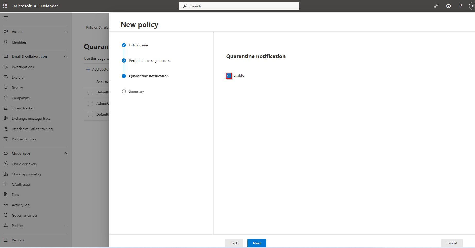 - Go to Threat policies > Quarantine policies and click Add custom policy.